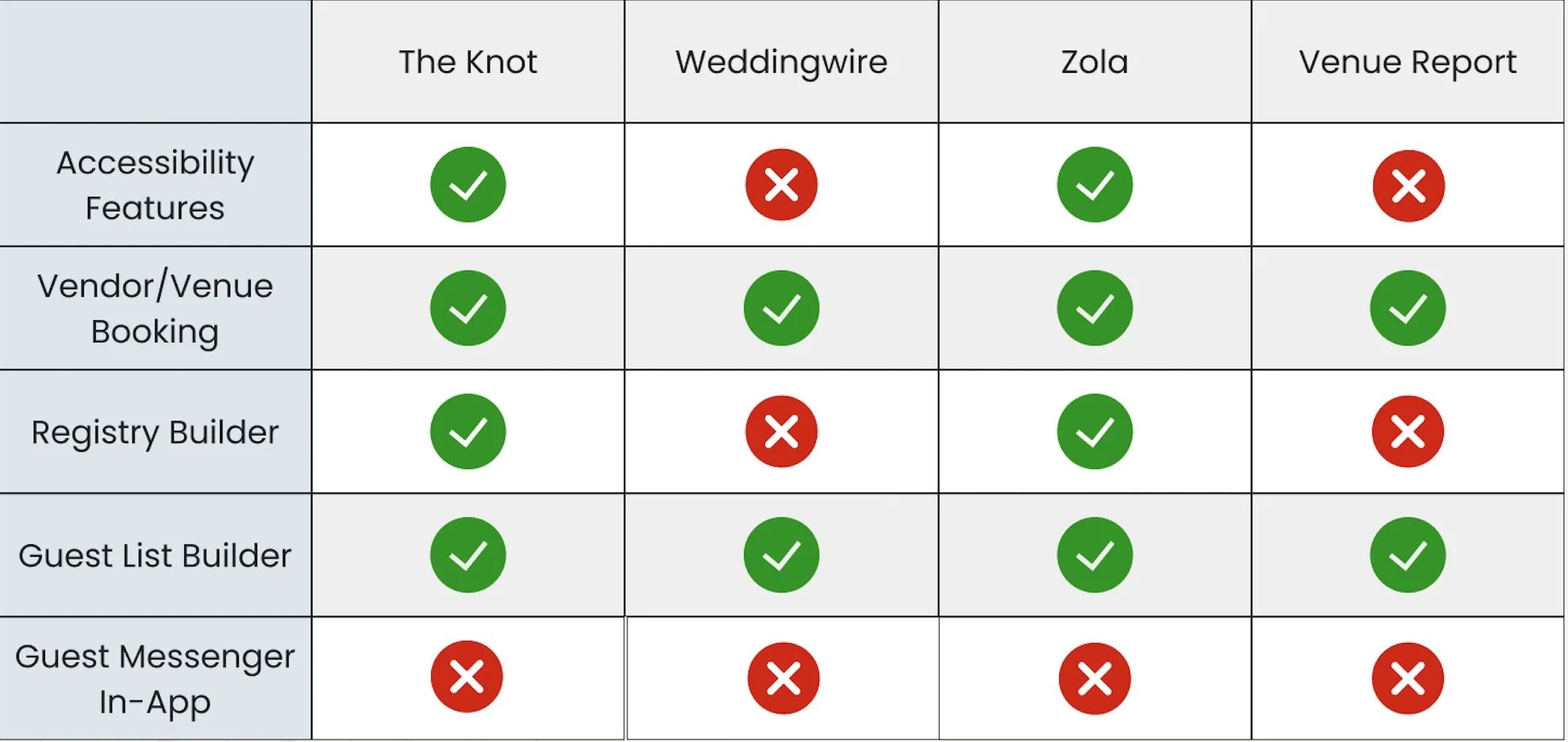 The Knot, Wedding Wire, Zola, and Venue Report, leading wedding planning platforms, each have strengths and areas for improvement. The focus should be on enhancing accessibility, refining registries, and upgrading guest messaging to stay competitive and meet user needs.
